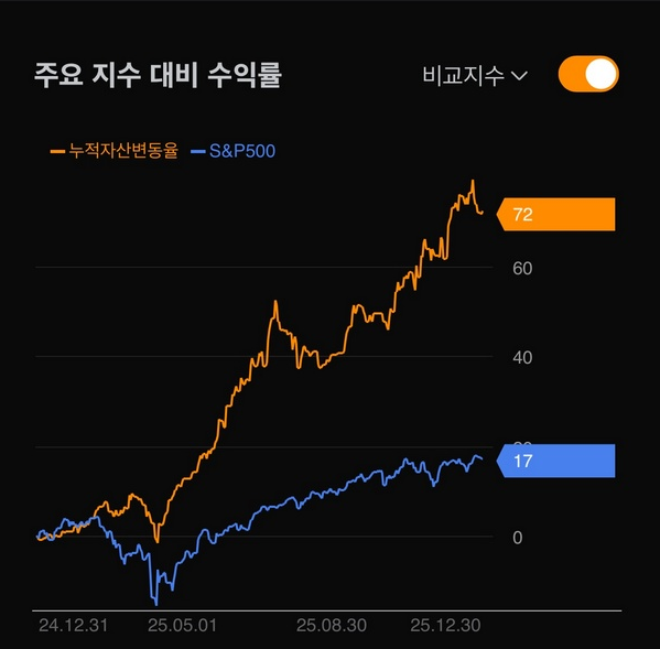 올해 수익은 KOSPI와 비슷한 수준의 수익을 냈고 S&P500보다는 상당한 차이를 보여주는 수익이 났습니다.