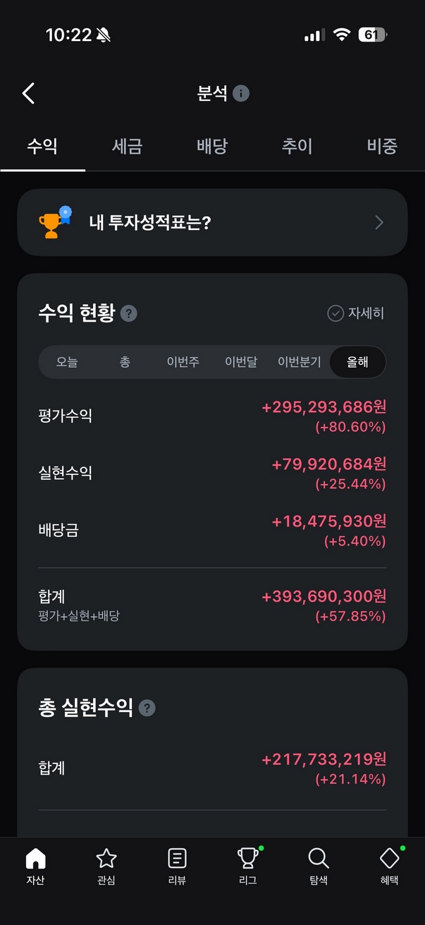 올해 운좋게 금융자산 수익률이 돈복사에 가까운 80%정도가 나왔습니다. 그 전까지도 그리 나쁘지 않은 수익률이어서 만족하고 있었는데 올해는 정말 로또라도 맞은것처럼 좋은 수익률이 나와버렸습니다.. 그동안 나름 돈그릇이 커저왔다고 생각했지만 너무 눈높이가 높아지는건 아닌지 갑자기 사라지는건 아닌지 하는 생각들이 듭니다.