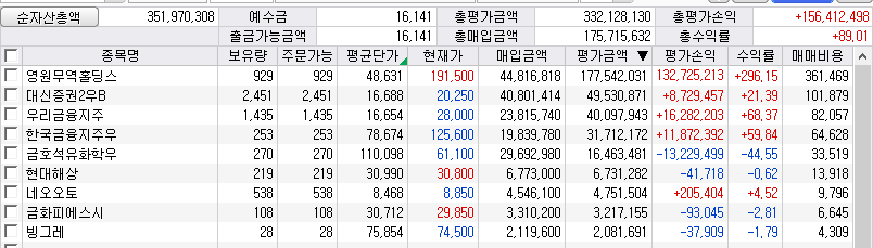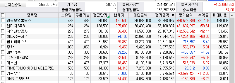 무학 : 자사주 맞교환한다고 욕먹다가 어제 날자로 밸류업공시를 함. 내용이 마음에 들어서 영무홀 50주를 팔고 매수함.