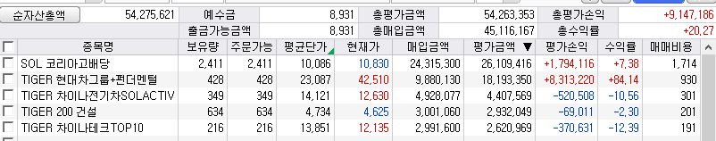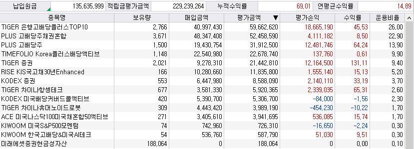 TIMEFOLIO KOREA플러스고배당액티브: 고배당ETF에 삼성전자 하이닉스가 있어서 외면했는데 올해 반도체 분위기가 바뀌면서 편입의 필요성을 느끼게되었다. 성장주 2개를 큰 비중으로 넣고도 배상수익를을 좋게 유지하는데 자가배당이지 싶다. 어쩃거나 PLUS고배당주보다 성정이 좋기에 편입함.