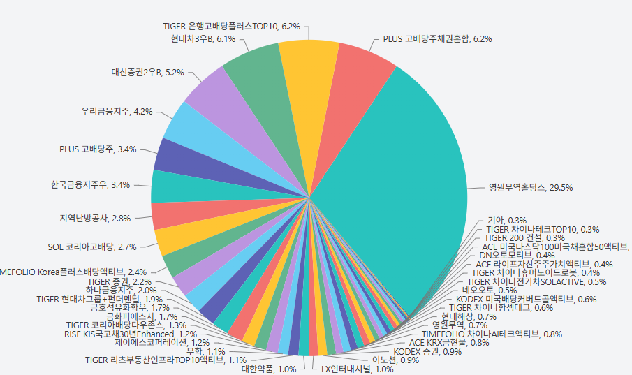 PLUS고배당주 : 22년 DC전환했을때 PLUS고배당주외에 마땅한 배당주가 없어서 비중을 높이 실었는데 지금은 차세대 배당 ETF들이 많이 출시되었다. 따라서 SOL 코리아고배당, TIGER 코리아배당다우존스, TIMEFOLIO korea 배당액티브 등으로 골고루 편입했다.